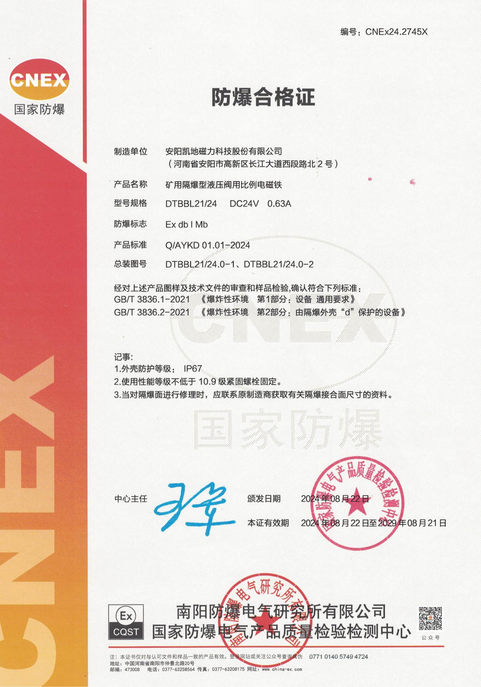 CNEx24.2745X DTBBL21 I類 防爆合格證 有效期至2029年8月21日
