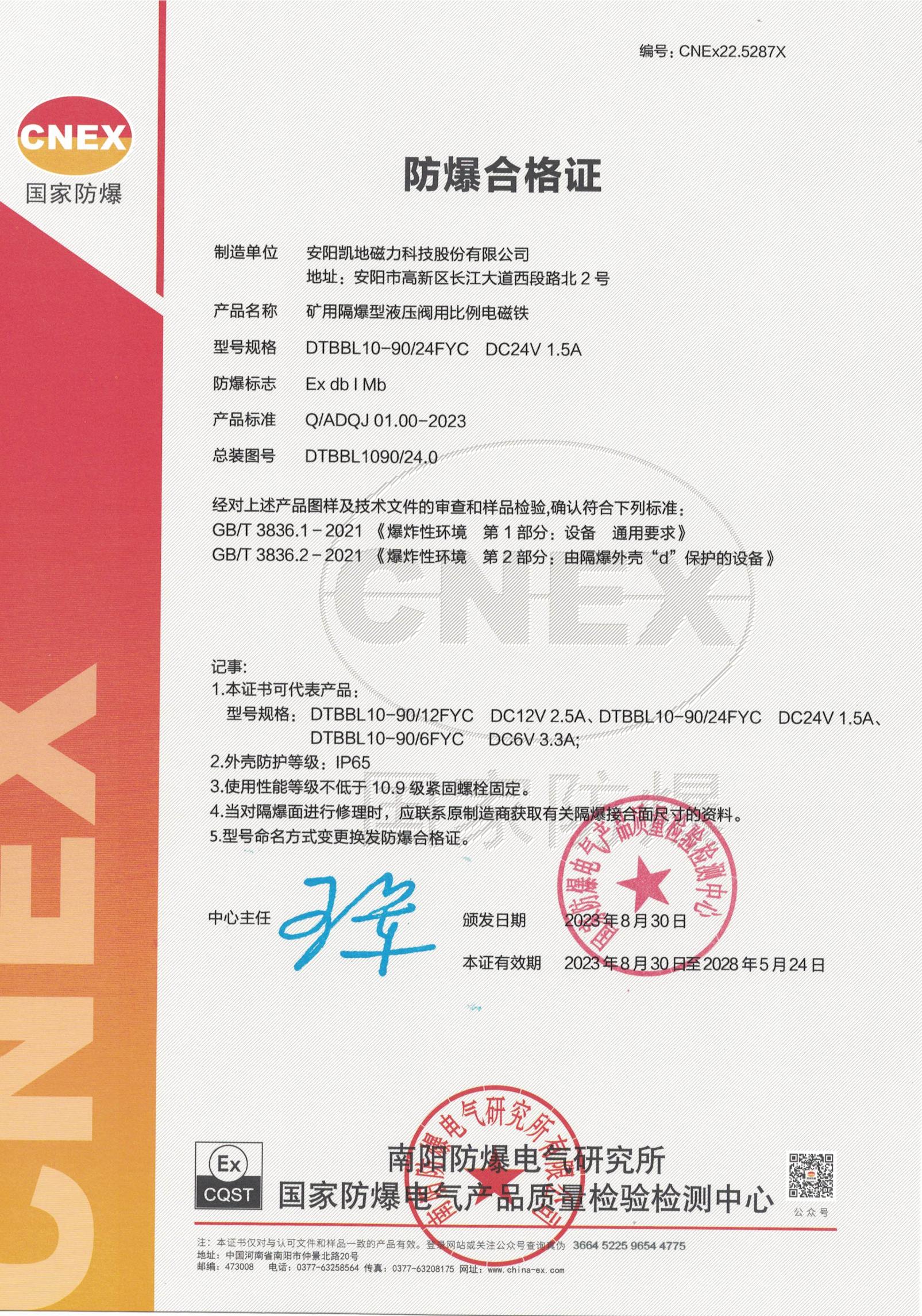 CNEx22.4021 DTBB12-90FYC II類 防爆合格證 有效期至2027年7月30日